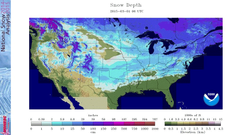 Since then, snow cover across the country has been cut in half as the animation above illustrates. The NOHRSC analysis on March 8 showed that 30.1 percent of the Lower 48 states was covered by snow. The darker blue and purple shadings show the deepest snowpack remaining in New England, the northern Great Lakes and the Rockies. Meanwhile, the lighter shades of blue show areas where snow cover was lighter and prone to melting faster.