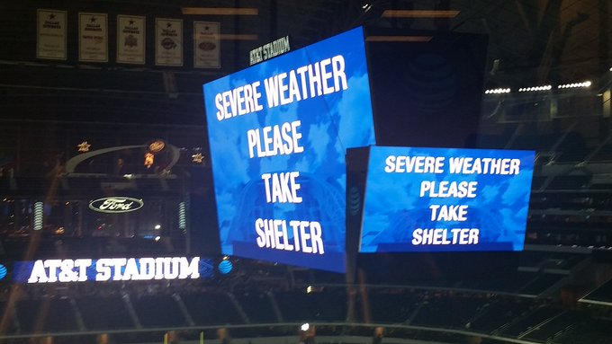 Main video board warning people still inside @ATTStadium of severe weather approaching #txwx #krldwx