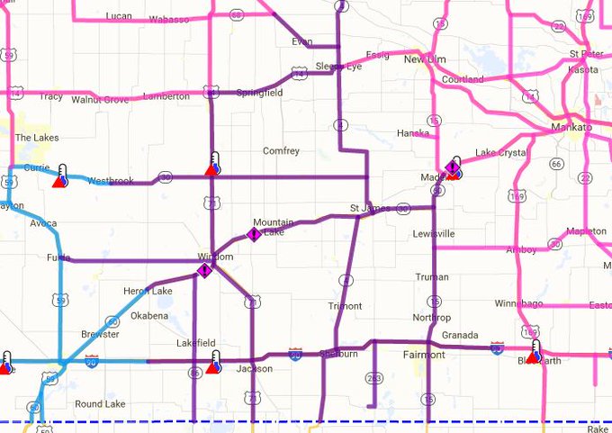 Purple = Hazardous and NO TRAVEL ADVISED. White out conditions due to heavy snow and high winds.